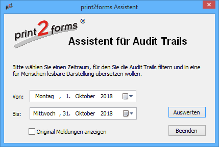 Um die für Menschen nicht wirklich auswertbaren Audit-Trails anzuzeigen, existiert ein weiteres neues Programm p2fAudit.exe, welches als Assistent für das print2forms-Administrationsprogramm geschrieben ist.