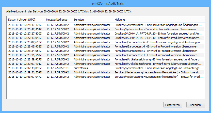 Nach einem Klick auf die Schaltfläche Auswerten wird das eigentliche Fenster zur Anzeige der Audit-Trails geöffnet. Über der Tabelle mit den Meldungen wird der eingestellte Zeitraum für die Auswertung als Zeit in UTC angezeigt. Hier ist zu sehen, dass im Oktober beim Startzeitpunkt noch die zwei Stunden Versatz der Sommerzeit und beim Endzeitpunkt die eine Stunde Versatz der Winterzeit zur Anrechnung kommen.