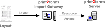 Es ist in der Regel oft so, daß das Import-Gateway auf einem anderen Rechner läuft, als der Rechner, auf dem Ressourcen und Anhänge erstellt werden. Auf dem letztgenannten Rechner muß lediglich der print2forms-Druckertreiber installiert und konfiguriert sein.