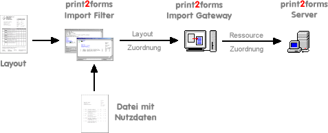 Beim Import-Filter selbst handelt es sich um ein spezielles Programm, daß auf dem Rechner, auf dem die Ressourcen erstellt werden, im Hintergrund ausgeführt wird. Dieses Programm simuliert einen Netzwerkdrucker, der zwar von beliebigen anderen Rechnern im Netzwerk benutzt werden kann, der aber die notwendigen Dialoge zur Zuweisung der Platzhalter zu den Nutzdaten nur auf diesem Rechner anzeigen kann.