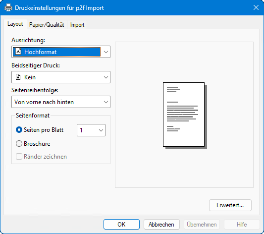 Setzen Sie die Angaben auf den Registerkarten Layout und Papier/Qualität entsprechend Ihren Anforderungen. Da beim Importieren keine Prozesse ausgeführt werden, sind hier alle diese Angaben gültig. Die Schaltfläche Erweitert aktivert einen weiteren Dialog mit Einstellungen.