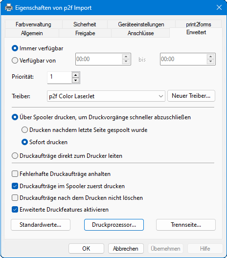 Auf dieser Registerkarte sollten lediglich die Punkte Erweiterte Druckfunktionen aktivieren und Über Spooler drucken aktiviert sein. Alle anderen Punkte können nach Anforderung aktiviert oder deaktiviert werden (den Treiber sollten Sie natürlich nicht ändern).