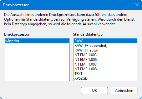 Stellen Sie sicher, daß der Druckprozessor auf WinPrint und der Standarddatentyp auf RAW eingestellt sind. Klicken Sie auf die Schaltfläche OK, um wieder auf die Registerkarte Erweitert zurückzukommen.