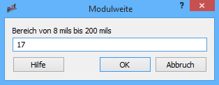 Mit diesem Wert wird für die linearen Barcodes festgelegt, wie breit ein schmales Modul gedruckt werden soll. Die Angabe erfolgt in der für Modulweiten üblichen Masseinheit mils = 1/1000 Inch (Zoll). Die numerische Eingabe ist aus praktischen Gründen auf den Bereich von 10 bis 200 mils beschränkt.