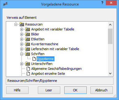 Zur Auswahl der zu ladenden Ressource wird eine Baumdarstellung der im print2forms-System bekannten Ressourcen angezeigt. Soll die aktuelle Auswahl gelöscht werden, muss die Schaltfläche Leer angeklickt werden. Ist die Auswahl leer, wird keine Ressource vorgeladen.
