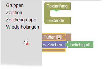 Auf der eigentlichen Arbeitsfläche des Editors liegt bereits ein erster Block, der immer vorhanden sein muß und nicht gelöscht werden kann. Er bildet die Basis für den Entwurf regulärer Ausdrücke zur Erkennung von Mustern.