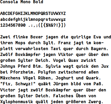 Dicktengleiche, serifenlose Schrift vorzugsweise als attraktiverer Ersatz für ursprünglich mit der Schrift Courier erstellte Dokumente. Die Alphabete der folgenden Sprachgruppen werden unterstützt: Afrikaans, Archaic Greek Letters, Baltisch, Einfaches Kyrillisch, Einfaches Griechisch, Katalanisch, Zentral Europa, Esperanto, Euro, Igbo Onwu, IPA, Lateinische Ligaturen, Pinyin, Rumänisch, Türkisch, Vietnamesisch und ganz Westeuropa.