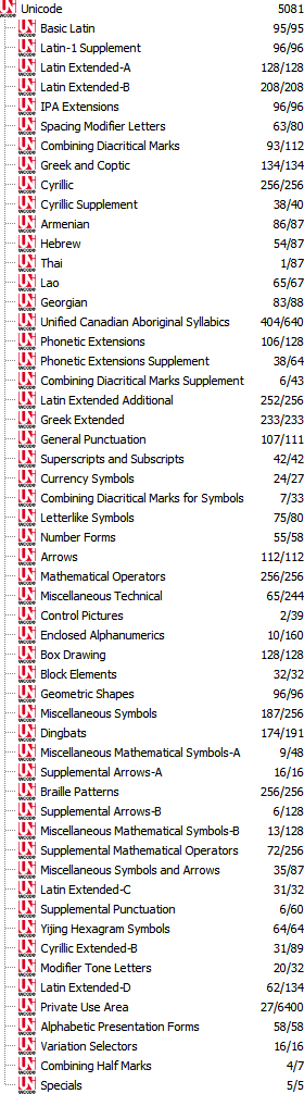 Die Schrift ist 'Unbound Unicode', das heist, sie kann in praktisch jedem PCL-Symbolset genutzt werden. Zugriff auf alle Zeichen setzt aber die Verwendung des Symbolsets 'Unicode' und die Nutzung der Kodierung 'UTF-8' voraus.