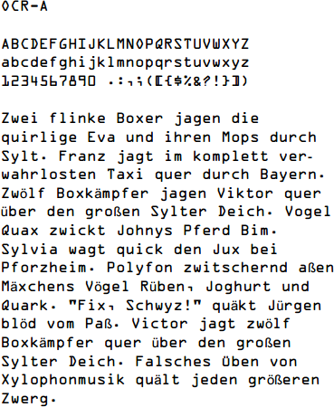 Dicktengleiche, serifenlose Schrift für automatische Textlesung durch Maschinen. Wird häfig im Finanzwesen eingesetzt.