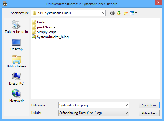 Der vorgeschlagene Dateiname zum Speichern der Aufzeichnung des Ausgangsdatenstroms besteht aus dem Namen des Druckers erweitert um einen Unterstrich und den Buchstaben 'p' (Printer) und der Erweiterung '.log'. Wird dieser Name nicht akzeptiert, kann er beliebig überschrieben werden. Ein Klick auf die Schaltfläche Speichern überträgt die gemachte Aufzeichnung in die angegebene Datei.