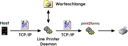 Für solche Anwendungsfälle ist ein besonderes Gateway gedacht: der Line-Printer-Daemon. Seine Aufgabe besteht im Prinzip darin, auf dem Netzwerk unter Port 515 auf Verbindungsanforderungen zu warten und die übertragenen Daten an die Drucker oder Gateways zur Bearbeitung durch print2forms weiterzuleiten. Dabei läuft der LPR-Teil des Protokolls auf dem druckenden Rechner und der LPD-Teil des Protokolls läuft im print2forms.