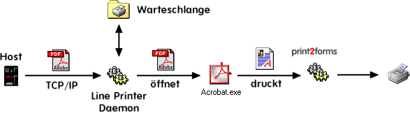 Dabei gibt es zwei mögliche Szenarien: zum einen sind die übertragenen Daten direkt vom Drucker oder Gateway zu verarbeiten und können direkt weitergeleitet werden. Die Zuordnung einer Warteschlange zu einem bestimmten Drucker oder Gateway geschieht über den Namen der Warteschlange, der mit dem Namen des print2forms-Druckers oder des -Gateways übereinstimmen muss.