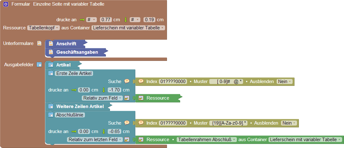 Ausserdem ist ein neuer, violetter Block oben rechts zu sehen, der dem Formular selbst eine Ressource zuordnet. Sofort erkennbar ist, dass die Ressource aus einem Subcontainer stammt.