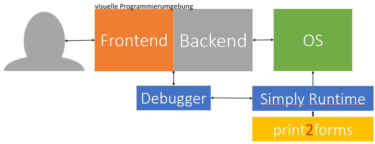 Das Hauptproblem bei der Anbindung eines Debuggers in die p2fSimply-Umgebung ist die Kommunikation mit dem zu debuggenden Skript. Die Möglichkeiten des Frontends sind hier, da es mithilfe von Javascript in einem Browser läuft, sehr begrenzt.