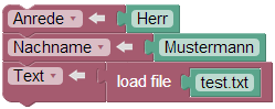 In diesem Beispiel wird der Block zum normalen Laden von dAteien verwendet. Daher wird der Text aus der Datei eins zu eins übernommen und in der Variablen „Text“ abgelegt. Es wird keine Ersetzung vorgenommen, auch wenn Variablen mit passendem Nachen vorhanden sind!