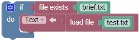 Oft ist es sinnvoll zu prüfen, ob eine Datei vorhanden ist, bevor diese verwendet wird. Auch für diese Funktion steht ein Block zur Verfügung. Beachten Sie, dass dieses Beispiel auch eine Verzweigung enthält, mit der es möglich ist, Blöcke nur unter bestimmten Bedingungen auszuführen. In diesem Fall wird die Datei eben nur geladen, wenn sie auch existiert.