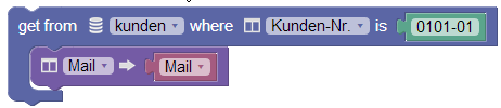 Es ist auch möglich, Daten aus der Datenbank zu erhalten anstatt welche zur Datenbank zu schicken. Dazu verwenden Sie den „get from“ Block, geben, wie beim „update“, eine Tabelle und ein eindeutiges Selektionskriterium an und dann Blöcke für jedes Feld, dessen Wert Sie aus dem Datensatz brauchen. Diese werden in die angegebenen Variablen abgelegt und stehen so dann zur weiteren Verarbeitung zur Verfügung.