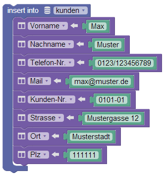 Wenn Sie einen neuen Datensatz in die Datenbank einfügen möchten, benötigen Sie den oben Dargestellten Block. In diesem Beispiel soll der Kundentabelle ein neuer Kunde hinzugefügt werden, daher wird der „insert into“ Block verwendet. Dieser benötigt die Tabelle, in die eingefügt werden soll. Außerdem benötigt er einen weiteren Block für jedes Feld des Datensatzes, das gefüllt werden soll. In diesen Blöcken wird der zu setzende Wert angegeben. Dies kein ein Literal wie ein Text oder eine Zahl, aber auch eine Variable sein.