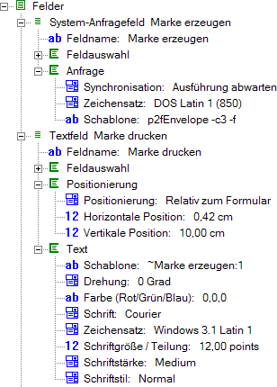 Die Angabe Ausführung abwarten im System-Anfragefeld sorgt dafür, dass mit dem Druck des Formulars gewartet wird, bis die Systemfeldapplikation beendet wurde und die angefragten Daten wirklich zur Verfügung stehen. Die Angabe des Zeichensatzes ist in diesem Fall unkritisch, weil die Kommandos für p2fEnvelope nur ASCII-Zeichen enthalten.