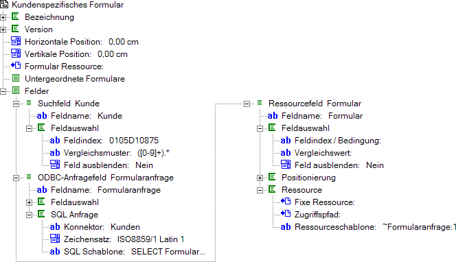 Das Ergebnis dieser SQL-Anweisung steht jetzt unter dem Namen des ODBC-Anfragefeldes zur Verfügung. Im Ressourcefeld Formular wird das Ergebnis der SQL-Anweisung als Name einer Ressource verwendet.