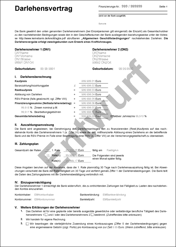 Der Client erkennt, dass der Vordruck zum Text gedruckt werden soll, und unterlässt daher die Ersetzung der Platzhalter durch - hier eh nicht vorhandene - Nutzdaten. Stattdessen markiert er die Platzhalter, indem er sie in einem Grauton ausgibt. Damit sind die Namen und Positionen der Platzhalter im Ausdruck leicht auszumachen.