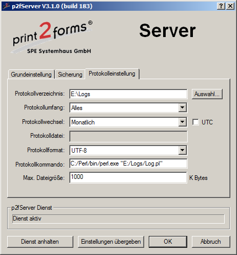 Die maximale Grösse der eigentlichen Log-Dateien des print2forms-Servers - Name beginnt mit p2fServer - kann im Kontrollfeld des Servers eingestellt werden. Erreicht die Log-Datei diese Grösse, wird sie geschlossen, ihr Name erhält das Suffix .old und es wird eine neue Log-Datei geöffnet. Eine eventuell bereits vorhandene Log-Datei mit dem Suffix .old wird dabei überschrieben.