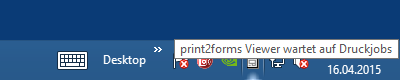 Erzeugt nun der print2forms-Client Druckdaten, nimmt er über das Netzwerk Verbindung mit dem Programm auf und überträgt die Druckdaten. Sobald alles übertragen ist, baut der print2forms-Client die Netzwerkverbindung ab, und das Programm übergibt die eben erzeugte PCL-Datei an das Anzeigeprogramm. Für die Dauer der Anzeige bleibt das Icon des Programms Grün und es werden keine weiteren Druckdaten entgegengenommen.