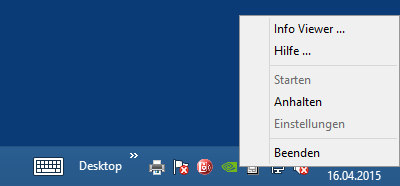 Klickt man mit der rechten Maustaste auf das Icon, erscheint ein Kontextmenü. Die einzelnen Menüpunkte sind je nach aktuellem Betriebszustand des Programms aktiviert oder deaktiviert.