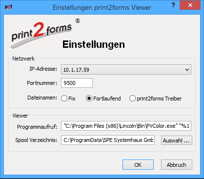 Mit der Auswahl Dateinamen kann entschieden werden, ob mit der Einstellung Fix das Programm nur eine einzige Datei für das Zwischenspeichern der Druckaufträge verwendet (mit dem Namen VIEW.PCL), oder mit der Einstellung Fortlaufend mehrere durchnumerierte Dateien erzeugt werden sollen (mit den Namen VIEW_###.PCL). Wird die Auswahl print2forms Treiber aktiviert, geht das Programm davon aus, dass mit einem print2forms-Treiber gedruckt wird. Der Name der Datei mit dem Druckauftrag ist dann der Job-Name aus dem PJL-Kommando 'SET JOB'. Kann kein Job-Name ermittelt werden, werden die Dateien wie bei der Einstellung Fortlaufend durchnumeriert.