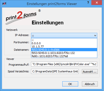 Da der Empfang der Druckdaten über das Netzwerk erfolgt, sind die Einstellungen der Netzwerkparameter für den Betrieb des Programms wichtig. Es muss eine IP-Adresse und eine Portnummer ausgewählt werden, an die sich der kleine Server zum Empfang der Druckdaten binden soll.