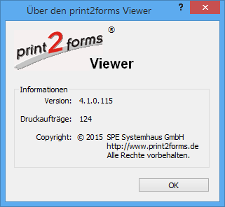 Bei Auswahl dieser immer angezeigten Option erscheint ein kleiner Dialog, der Auskunft über das Programm p2fViewer.exe gibt. Neben der Versionsnummer des Programms wird auch die Anzahl der bisher verarbeiteten Druckaufträge angezeigt.