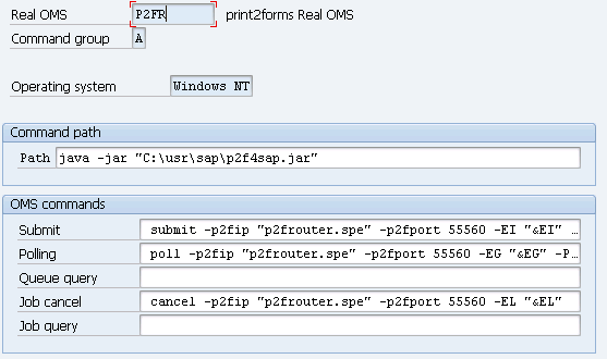 Dabei ersetzen Sie den Platzhalter %IP% durch die IP-Adresse oder den DNS-Namen des Rechners, auf dem der print2forms-Router ausgeführt wird. Beachten Sie das führende Leerzeichen vor den Einzelnen Kommandozeilen (submit, poll & cancel), da die Kommandos ansonsten nicht korrekt ausgeführt werden können!