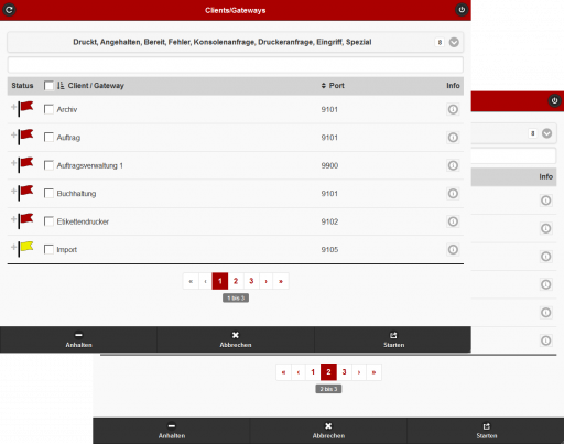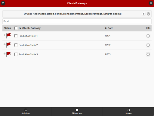 Wird die Liste der konfigurierten Clients und Gateways angezeigt, erscheinen am unteren Rand des Bildschirms drei Tasten zum Anhalten, Abbrechen und Starten von Clients und Gateways. Die mit diesen Tasten ausgelöste Aktion bezieht sich immer nur auf die in der Tabelle markierten Clients und Gateways. Wird die Check-Box in der Titelleiste der Tabelle aktiviert oder deaktiviert, werden alle Tabelleneinträge - auch die nicht angezeigten - aktiviert oder deaktiviert. |