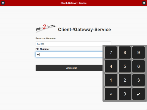 Die Apps für Tablets und die Web-Site starten mit dem Anmeldebildschirm. Hier muß sich der Benutzer mit seiner Benutzernummer und seiner PIN anmelden. Es sind dies die Informationen, die im Vorfeld auf dem print2forms-Server angelegt worden sind. Mit einem Druck auf die Taste oben rechts in der Titelleiste (Zahnrad) gelangt man in den Dialog mit Einstellungen der App. |