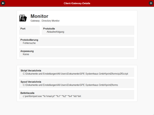 Die Detailinformation bei Gateways sieht etwas anders aus. Hier werden die Pfade angezeigt, die für den Zugriff auf Spool-Dateien und auf die Skripte verwendet werden sollen. Auch die Befehlszeile wird angezeigt. Der Aufbau und der Inhalt der Anzeige kann je nach Typ des Gateways etwas variieren. |