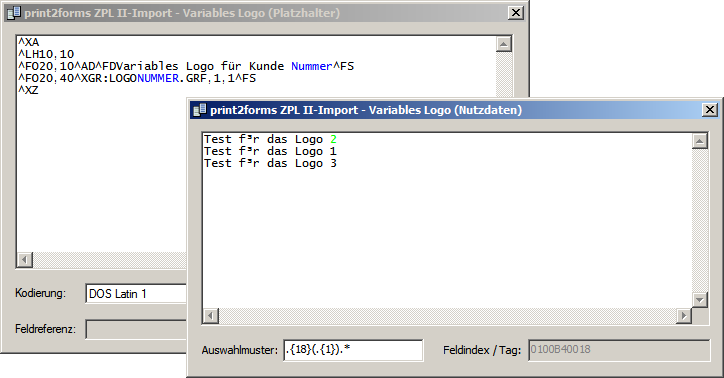 Jetzt ist alles soweit eingerichtet und ein erster Test mit den Nutzdaten kann erfolgen. Zum besseren Verständnis sind die Nutzdaten (PCL-Datenstrom) nachfolgend abgebildet: Es ist zu erkennen, dass zuerst ein Etikett für den Kunden 2, dann zwei für den Kunden 1, dann eines für den Kunden 3 und am Schluss wieder eines für den Kunden 1 gedruckt werden soll. Im Listing auf der rechten Seite ist zu sehen, welchen ZPL-Datenstrom print2forms aus diesen Nutzdaten erzeugt. Als erstes wird die Graphik für das Logo 2 geladen und anschliessend im Etikett aufgerufen. Es ist deutlich zu sehen, wie die beiden Platzhalter aus der Etikettenressource gegen die Ziffer 2 ausgetauscht worden sind. Anschliessend wird die Graphik für das Logo 1 geladen und ein Etikett mit diesem Logo gedruckt. Beim zweiten Etikett mit dem Logo 1 ist zu sehen, dass die Graphik nicht wieder geladen wurde. print2forms weiss, dass die Graphik bereits im Drucker ist, und unterdrückt das wiederholte Laden der Graphiken.