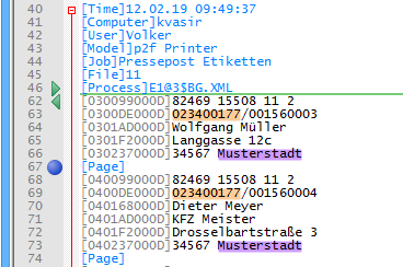 Das ist in der Anzeige der Ablaufverfolgung innerhalb des Drucker-/Gateway-Services naturgemäß etwas schwierig, weil nur ein begrenzter Ausschnitt des Protokolls sichtbar ist (Längenbeschränkung auf 2048 Zeilen), und weil Möglichkeiten wie Falten oder das Setzen von Lesezeichen nicht zur Verfügung stehen.