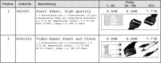 ... [0106810000] 1 SK20HQT Scart Kabel, high quality St 230 0 230 [0106BD0000] 1 x Scartstecker auf 1 x Scartstecker (21 pin), [0106EA0000] transparentes Kabel mit vergoldeten Kontakten, [0107170000] 4 x 0.14 mm² abgeschirmt (Audio), 6 x 75 Ohm [0107440000] RG59 (Video), Länge 2 m [0107DA0000] 2 SK20F1 Scart-Flachkabel St 160 0 160 [0108160000] Stecker auf Stecker, 21 polig belegt, 1 m [0108AC0000] 3 SV3 Scart Verteiler St 10 0 10 [0108E80000] Vollständig beschaltet für den Anschluß von 3 [0109150000] Geräten, alle Buchsen parallel geschaltet [0109AB0000] 4 AVS1020 Video-Kabel Scart auf Cinch St 160 0 160 [0109E70000] 1 x Scartstecker auf 3 x Cinchstecker, 2 x [010A140000] 0.14 mm² abgeschirmt (Audio), 1 x 75 Ohm [010A410000] RG 59 (Video), Länge 1 m [010AD70000] 5 AV3030 Video-Kabel Cinchstecker St 260 0 260 [010B130000] 3 x Cinchstecker auf 3 x Cinchstecker, 2 m [010BA90000] 6 HC7502 AV-Kabel S-VHS/Cinch - Scart St 20 5 15 [010BE50000] 4 pol. S-VHS-Stecker / 2 Cinchstecker nach [010C120000] Scartstecker, verchromte Metallstecker, vergol- [010C3F0000] dete Kontakte, High Quality, molded ...