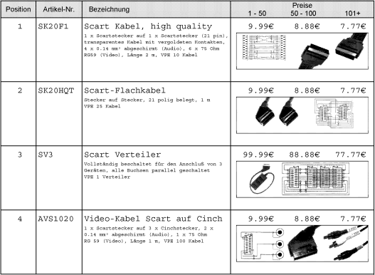 ... [0106450000] 1 SK20F1 Scart Kabel, high quality 9.99€ 8.88€ 7.77€ [0106810000] 1 x Scartstecker auf 1 x Scartstecker (21 pin), [0106AE0000] transparentes Kabel mit vergoldeten Kontakten, [0106DB0000] 4 x 0.14 mm² abgeschirmt (Audio), 6 x 75 Ohm [0107080000] RG59 (Video), Länge 2 m, VPE 10 Kabel [0108070000] 2 SK20HQT Scart-Flachkabel 9.99€ 8.88€ 7.77€ [0108430000] Stecker auf Stecker, 21 polig belegt, 1 m [0108700000] VPE 25 Kabel [0109C90000] 3 SV3 Scart Verteiler 99.99€ 88.88€ 77.77€ [010A050000] Vollständig beschaltet für den Anschluß von 3 [010A320000] Geräten, alle Buchsen parallel geschaltet [010A5F0000] VPE 1 Verteiler [010B8B0000] 4 AVS1020 Video-Kabel Scart auf Cinch 9.99€ 8.88€ 7.77€ [010BC70000] 1 x Scartstecker auf 3 x Cinchstecker, 2 x [010BF40000] 0.14 mm² abgeschirmt (Audio), 1 x 75 Ohm [010C210000] RG 59 (Video), Länge 1 m, VPE 100 Kabel [Page] ...