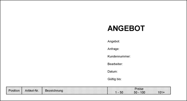 Um den Tabellenrahmen in der Länge an die Nutzdaten anpassen zu können, muß der Rahmen in zwei Teile zerlegt werden: den Tabellenkopf mit den Beschreibungen der Spalten, und in einen nach oben offenen Rahmen, der eine Tabellenzeile begrenzt. Der Tabellenkopf befindet sich in einer Ressource mit dem Namen 'Tabellenkopf' im Subcontainer 'Angebot mit variabler Tabelle' und hat folgendes Aussehen (die übrigen Bestandteile des Angebotsformulars wurden hier gleich mit aufgenommen):