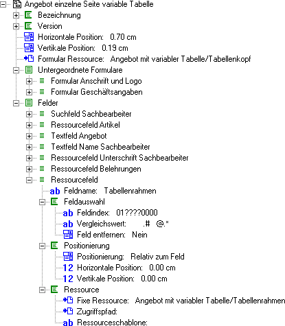 Im Formular 'Angebot einzelne Seite variable Tabelle' muß jetzt dafür gesorgt werden, daß zunächst der Tabellenkopf einmal gedruckt wird, und dann für jede Tabellenzeile ein Rahmen hinzugefügt wird. Die Ressource 'Angebot mit variabler Tabelle/Tabellenkopf' wird einfach als 'Formular Ressource' aufgenommen, was hier möglich ist, da alle sonstigen Bestandteile des Formulars mit aufgenommen wurden. Für das mehrfache Zeichnen des Tabellenrahmens ist es natürlich notwendig, die Tabellenzeilen zu erkennen. Dies leistet das Ressourcenfeld 'Tabellenrahmen':