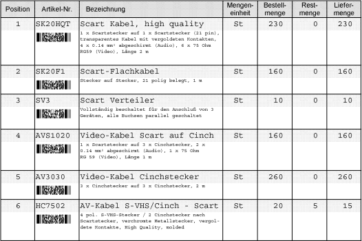 Für den Druck der Abschlußlinie ist das dritte Ressourcenfeld mit dem Namen 'Abschlußlinie' zuständig. Auch hier wird mit dem Feldindex '01????0000' und dem Vergleichsmuster ' {19}[A-Za-z0-9].*' nach den weiteren Artikelzeilen gesucht. Der entscheidende Unterschied zum vorherigen Feld ist aber, daß durch die Positionierung 'Relativ zum letzten Feld' nur einmal die Ressource 'Tabellenrahmen Abschluß' aus dem Subcontainer 'Lieferschein mit variabler Tabelle' gedruckt wird. Dadurch entsteht genau eine Abschlußlinie und man erhält als Resultat die fertige Tabelle: