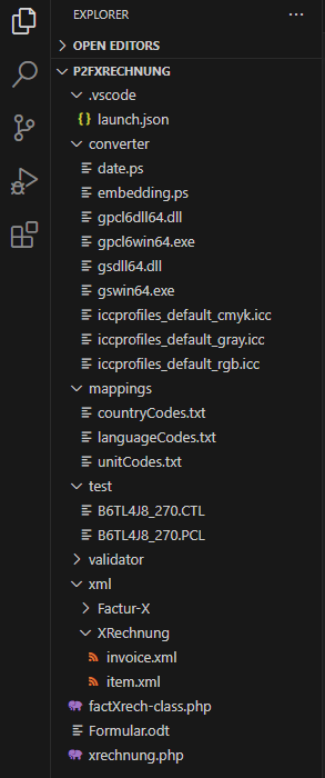 Im Archiv sind auch die entsprechenden Konfigurationsdateien für Visual Studio Code enthalten, sodass der jetzt neu erscheinende Ordner p2fXRechnung direkt in der Entwicklungsumgebung geöffnet werden kann. Es sollte sich im Dateiexplorer die rechts abgebildete Struktur ergeben - zunächst aber mit einem unvollständigen Unterordner converter.