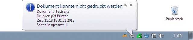 Klicken Sie in diesem Dialog zunächst einmal auf die Schaltfläche OK oder Schliessen. Mit dem Testausdruck wurde eine Netzwerkverbindung mit dem print2forms-Client oder -Gateway hergestellt, der die Druckdaten entgegennimmt und entsprechend dem ausgewählten Druckprozess verarbeitet. Falls der print2forms-Client selbst die Druckdaten nochmals spoolt, kann es ein paar Sekunden dauern, bis Sie den Ausdruck tatsächlich in Händen halten. Beim Gateway ist es vom gewuenschten Resultat (Fax, EMail, Internetseite, Archivierung, etc) abhängig, ob, wann und wie Sie ein positives Testresultat erhalten. Fragen Sie in diesen Fällen den Administrator.