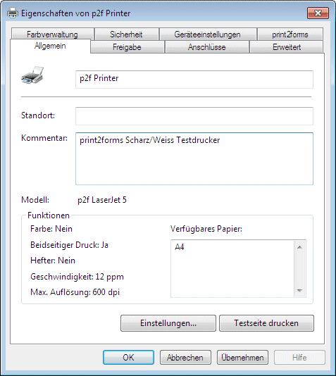 Es nicht ganz so einfach, die korrekte Installation eines Druckers mit dem print2forms-Treiber zu testen. Dies liegt daran, daß die Druckprozesse im print2forms-System gewisse Annahmen über die Art der Druckdaten machen. Zum Beispiel könnte es durchaus sein, daß ein Druckprozess die erste Seite des Druckjobs ignoriert. Dann wäre ein einfacher Test mit der Windows-Testseite immer negativ.