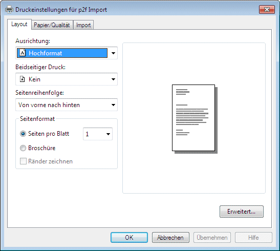 Auf der letzten Registerkarte Import müssen jetzt noch die Parameter für den print2forms-Treiber gesetzt werden.