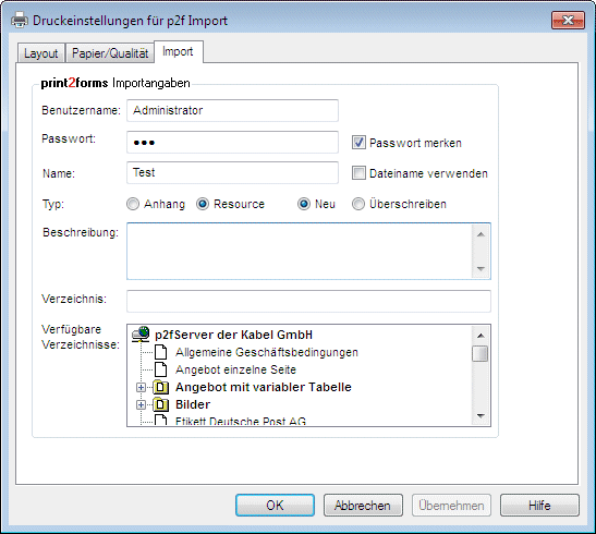 Beim Import wird eine Ressource oder ein Anhang auf den print2forms-Server übertragen. Aus diesem Grund müssen in den Feldern Benutzername und Passwort die Angaben eines gültigen print2forms-Benutzers eingesetzt werden. Mit einem Haken bei Passwort merken kann sich der Treiber das Passwort merken, und es muß nicht mit jedem Importvorgang neu eingegeben werden.
